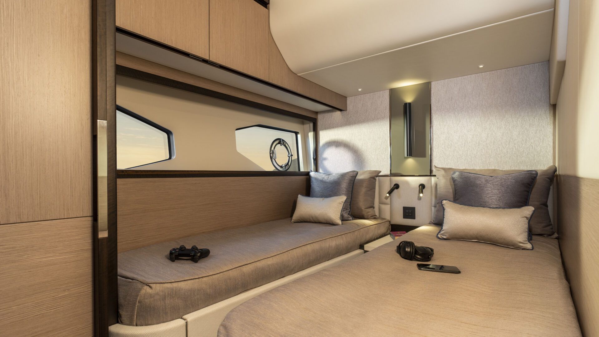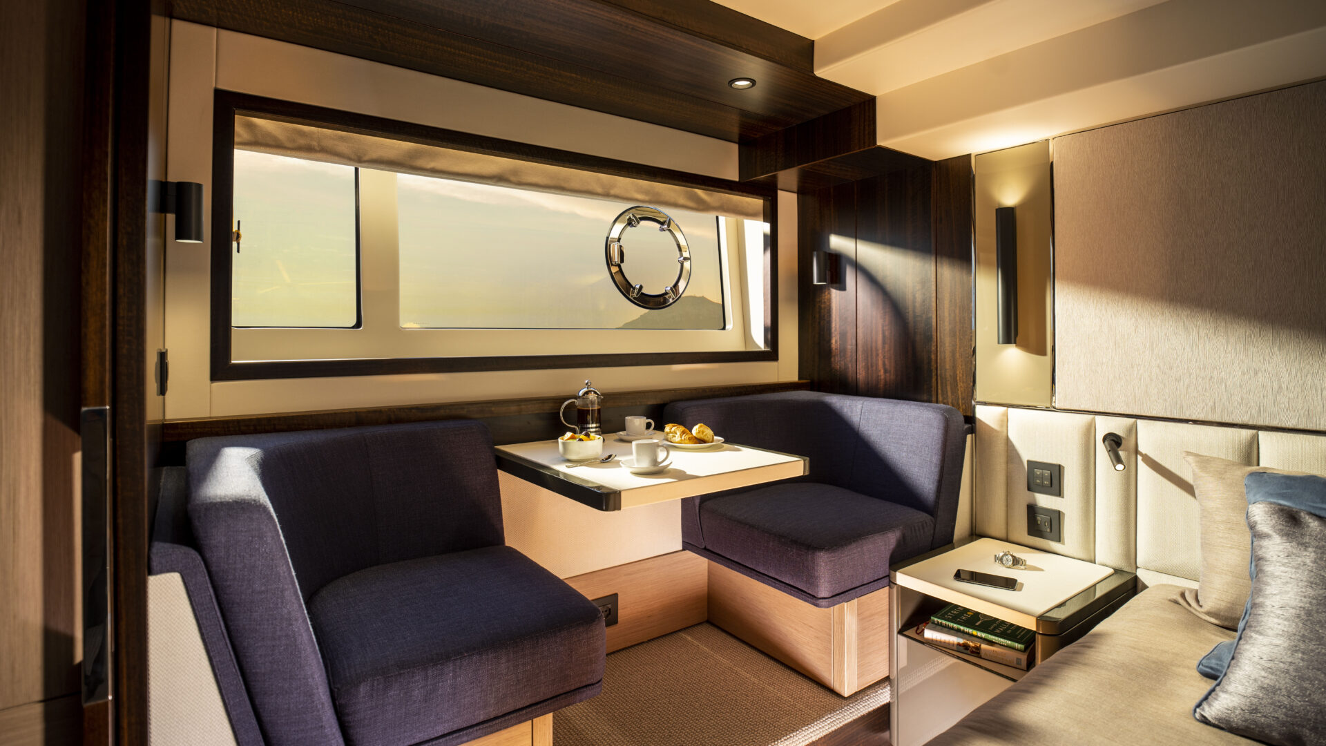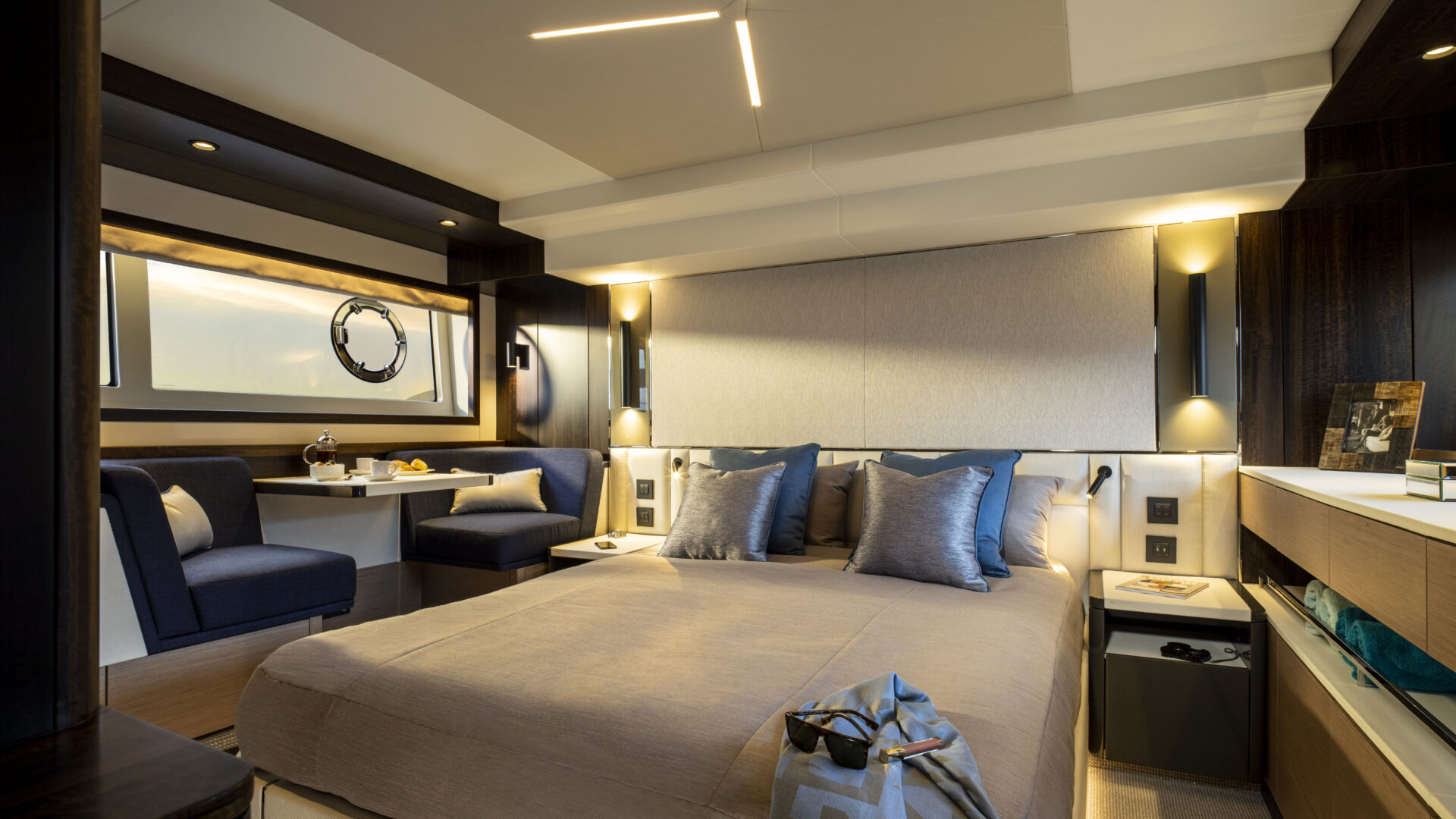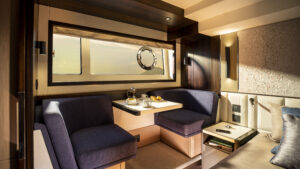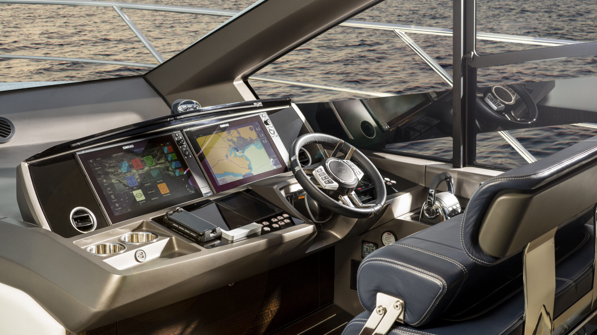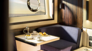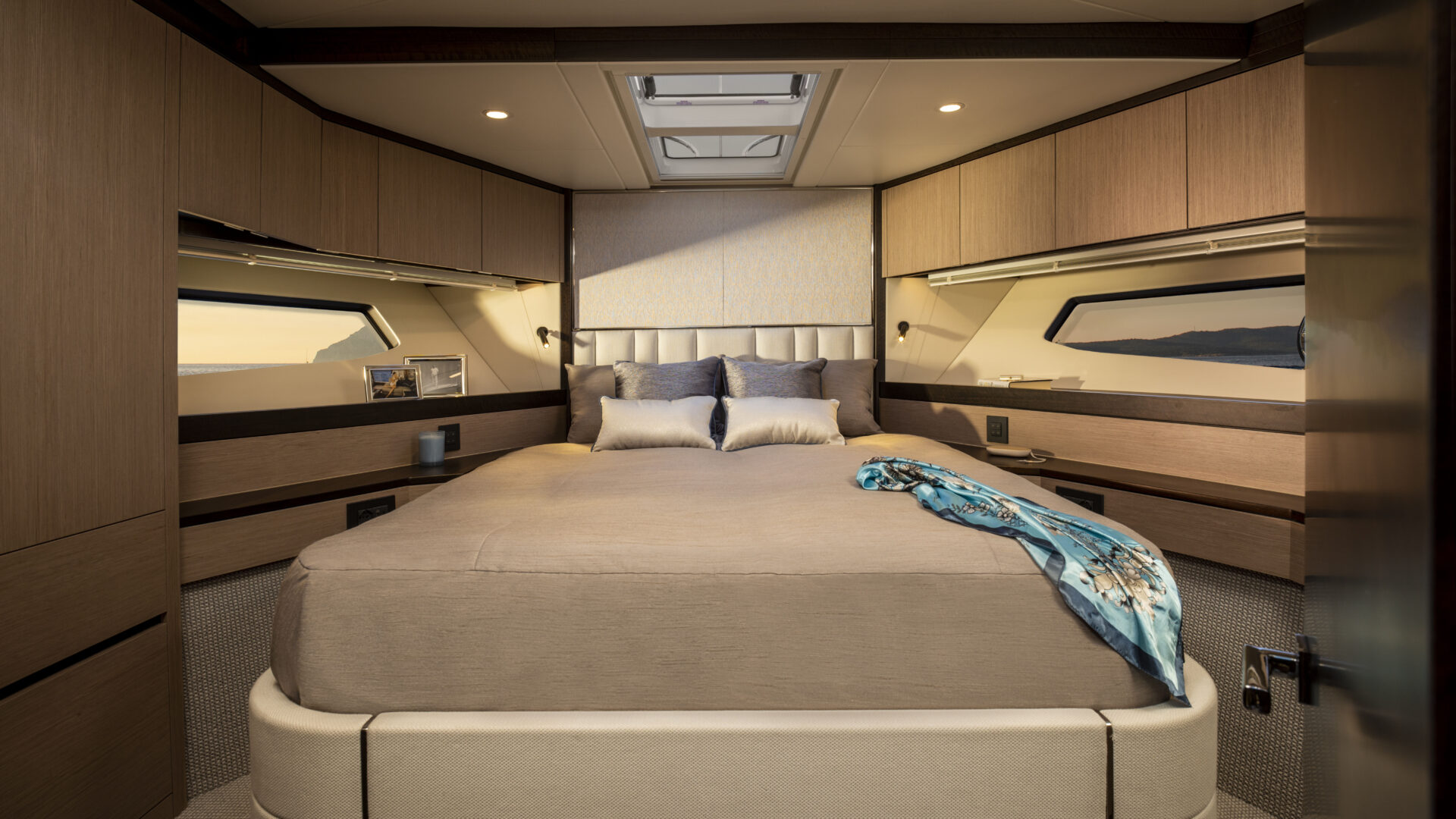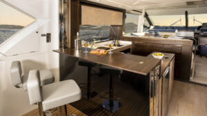 Ein Hauptmerkmal, dass die Manhattan 55 wirklich von seinen Mitbewerbern unterscheidet, ist das innovative, elektrisch betriebene Glasfenster im Cockpit und in der Bordküche, das auf Knopfdruck abgesenkt werden kann und neben der offenen Cockpittür eine wirklich außergewöhnliche Innen-/Außenumgebung schafft.