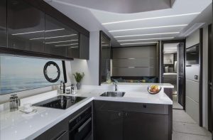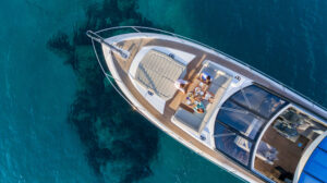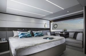 Im Innern erweist sich der großzügige Salon als perfekter Ort der Unterhaltung, mit einer üppigen Sitzgruppe, reichlich Stauraum und einer umfassenden Bar-Konsole an der Backbordseite; alles unter einem außergewöhnlichen Panorama-Glasschiebedach.