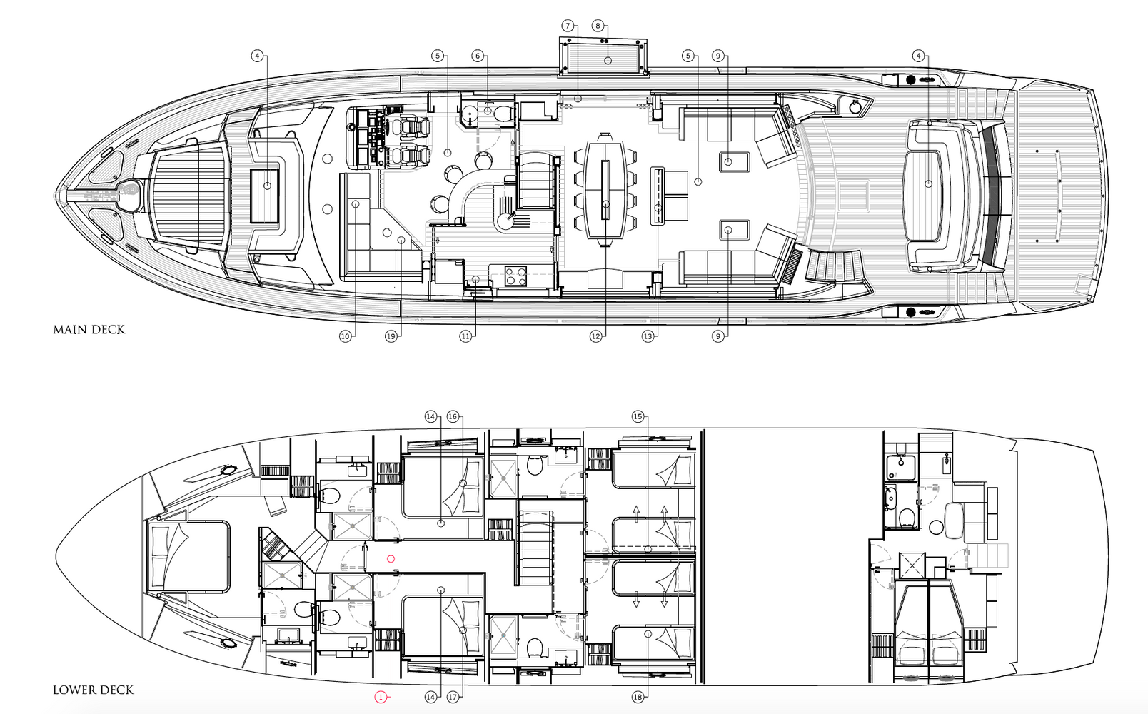 All five guest cabins are located on the lower deck, all with ensuite bathrooms. The Master Cabin is positioned forward, while the remaining four cabins are symmetrically arranged along each side of the hull, comprising two double cabins and two twin cabins.