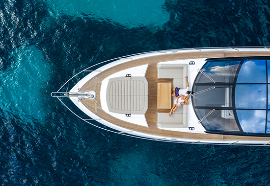 En outre, vous trouverez un mécanisme de porte de cockpit ingénieux qui s'ouvre de manière conventionnelle ou s'escamote complètement sous le niveau du pont, le tout en un tournemain. Ce Predator offre le meilleur des deux mondes afin de convenir à vos besoins et à l’environnement dans lequel vous naviguez. À l'intérieur, le salon de taille généreuse s'avère être l'endroit idéal pour se divertir, avec un somptueux coin sofa, de nombreux rangements et un mini-bar bien équipé à bâbord. Au-dessus, on découvre un incroyable toit coulissant panoramique en verre.