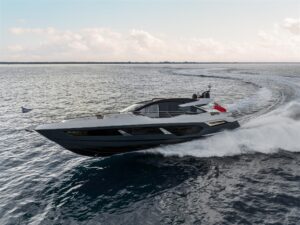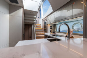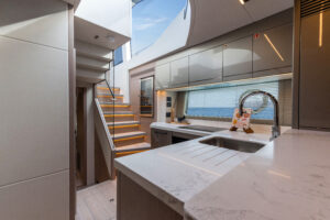 Aesthetic styling is prevalent in every detail. The yacht profile turns heads with stainless steel air intake cowlings and exterior handrails, contributing to the high-quality finish. There is an enhanced material selection, with new exterior upholstery and moulding options. Adventurous buyers will be captivated by a choice of four new grey hull colours. Overall, the exterior is aggressive and imposing, with a new, angular hull and superstructure glazing design.
