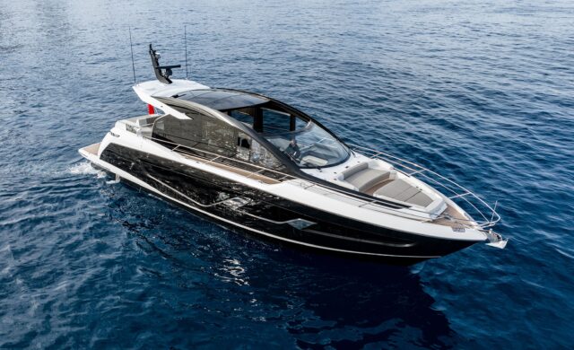 Aft, the open-plan space can be designed to the owner’s exact requirements. Furniture options include comfortable seating backed onto a large sun pad over the garage and a social bar unit with matching stools on the port side, a fully integrated wet bar or extended J-shaped lounge seating running aft from the galley across the width of the cockpit.