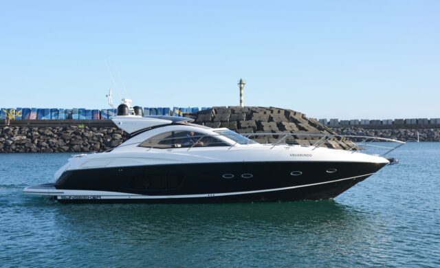 The San Remo was awarded “Best Sportscruiser of the year” in 2014 at the MBY awards and it is easy to see why. Powered by a pair of Volvo Penta IPS600 pod drives (plus the addition of a bow thruster), she is a pleasure to manoeuvre in close-quarters and exhilarating to helm on the open sea, cutting through rough water like only the best pedigree Sunseeker hulls can.