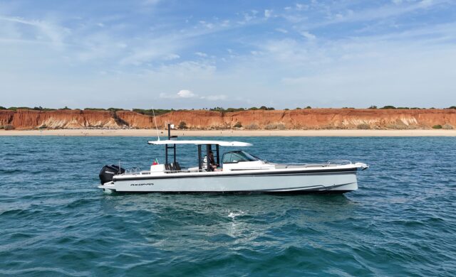 The Sun-Top design provides shade while maintaining the open, airy feel of the deck. This model features the Brabus Line package, enhancing its aesthetics and onboard comfort with exclusive materials, high-end upholstery, and premium finishes. The wet bar layout is perfect for entertaining, with a sink, fridge, gas grill and ample counter space for preparing refreshments on deck.