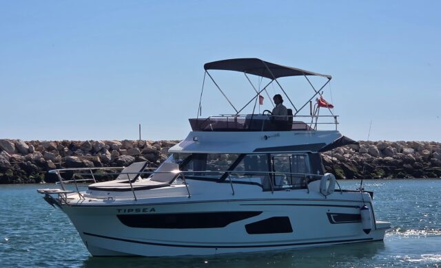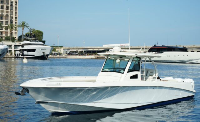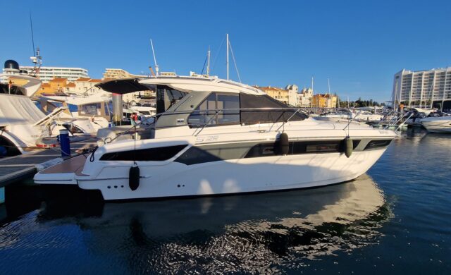 At the stern, a large integrated swim platform allows easy access to the water, making the boat ideal for swimming, watersports, or simply relaxing by the water.