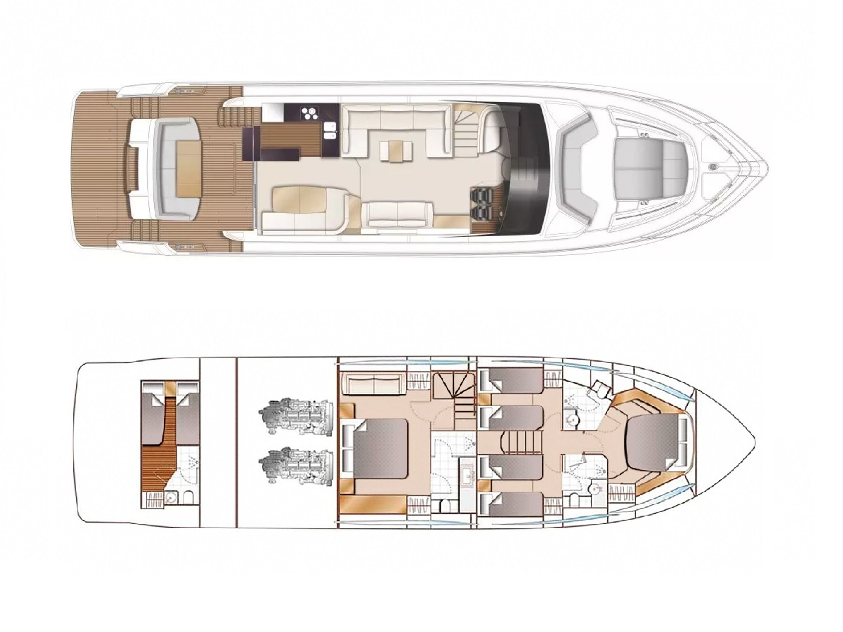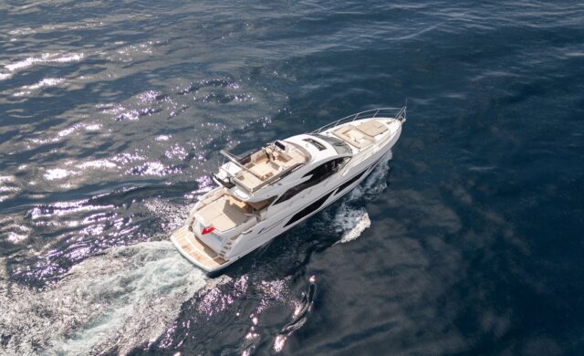 The social layout of her main deck features an aft galley arrangement which opens fully to the cockpit and a walkthrough foredeck area with additional sunbathing and seating areas. Out at sea, her performance feels light and responsive all the way up to top speed.