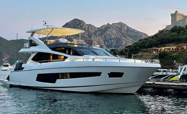 The F70 is the flagship of the flybridge range within Princess Yachts. With her generous flybridge she accommodates a large U-shaped dining area, served by a fully equipped wetbar, aft sunpad and forward seating area adjacent to the helm.