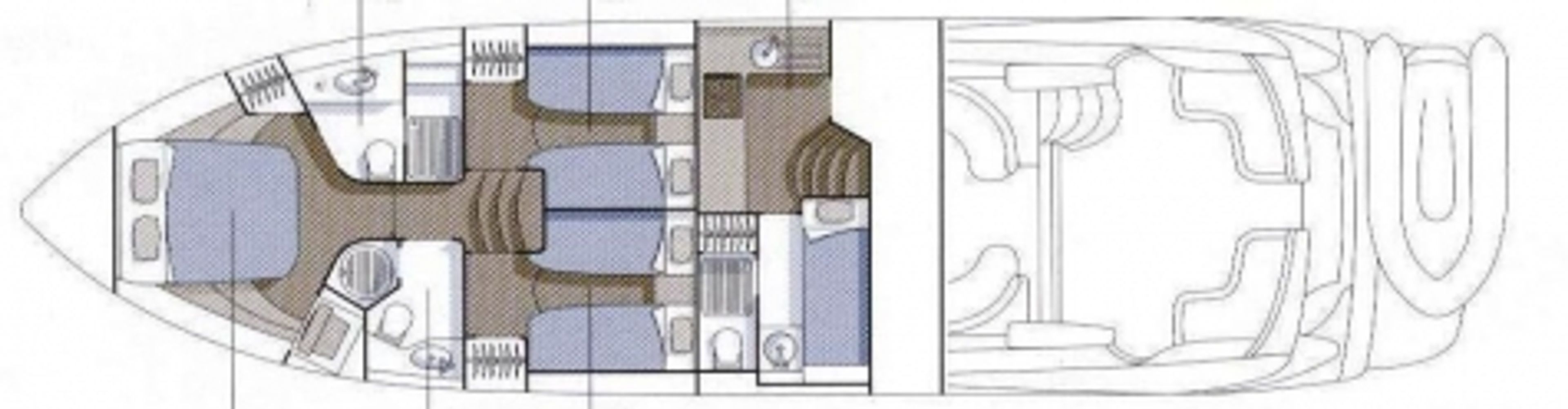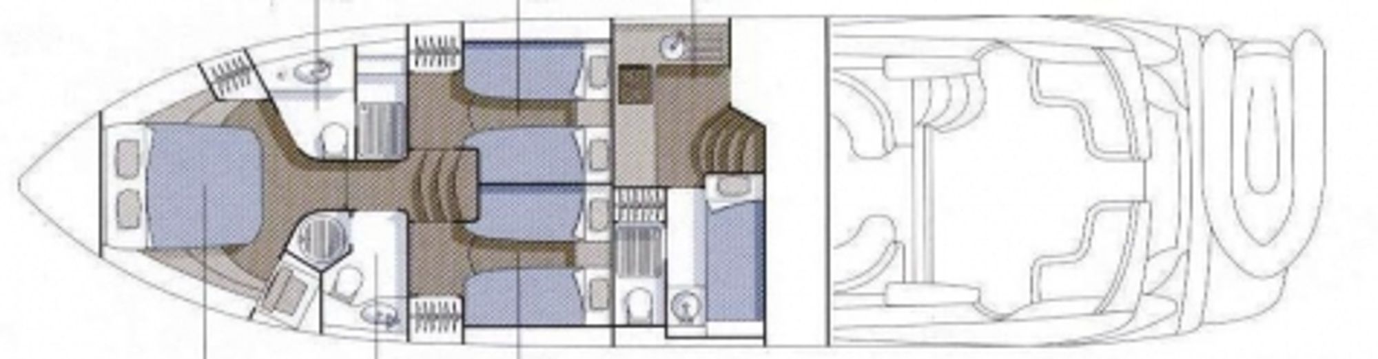 Large master cabin with en-suite facilities, second cabin with twin beds to port side and a third cabin with twin beds to starboard side.