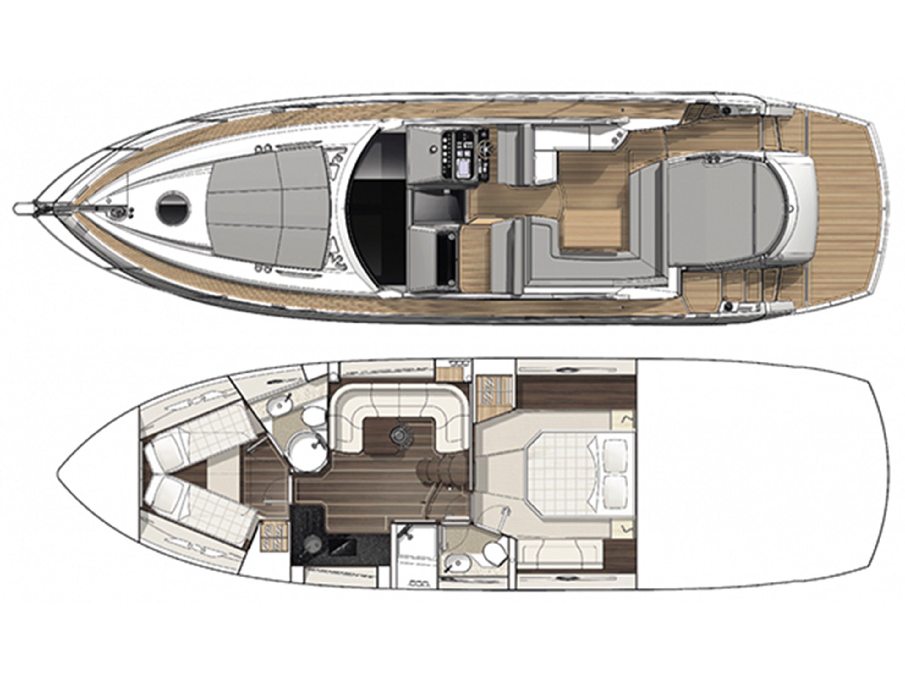 Two cabin, two head layout - full beam owner’s cabin aft with en-suite, and a forward guest cabin also with en-suite.