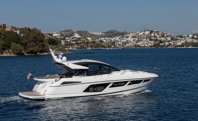 This yacht’s expansive cockpit and hydraulic swim platform make it perfect for both relaxation and water sports.