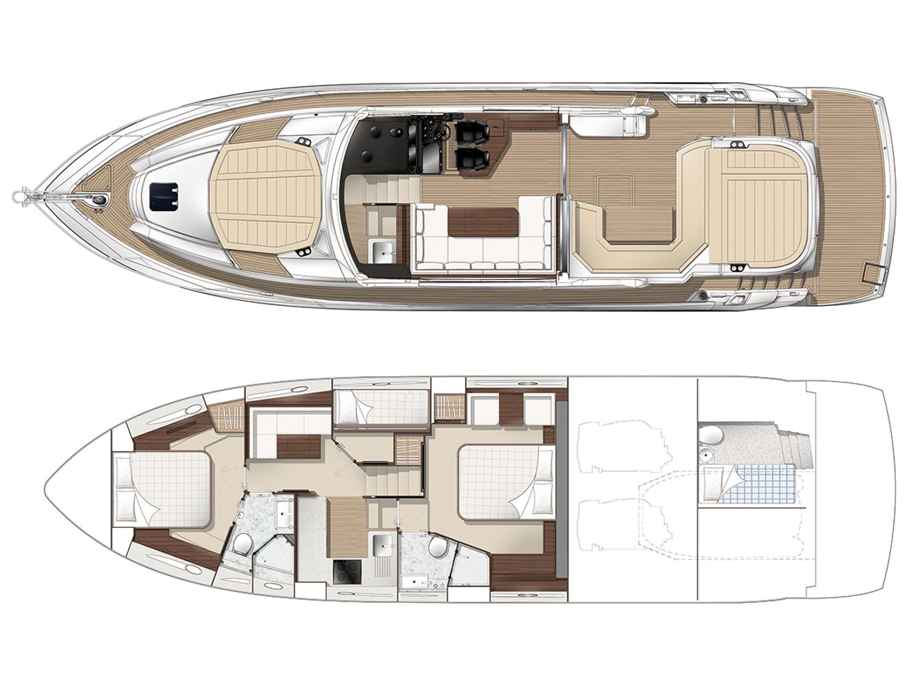 Below deck, you’ll find a well-appointed galley and snug saloon, leading to three spacious cabins and two en-suite heads. The full-beam master cabin is flooded with natural light through large windows, in line with Sunseeker’s latest design philosophy.