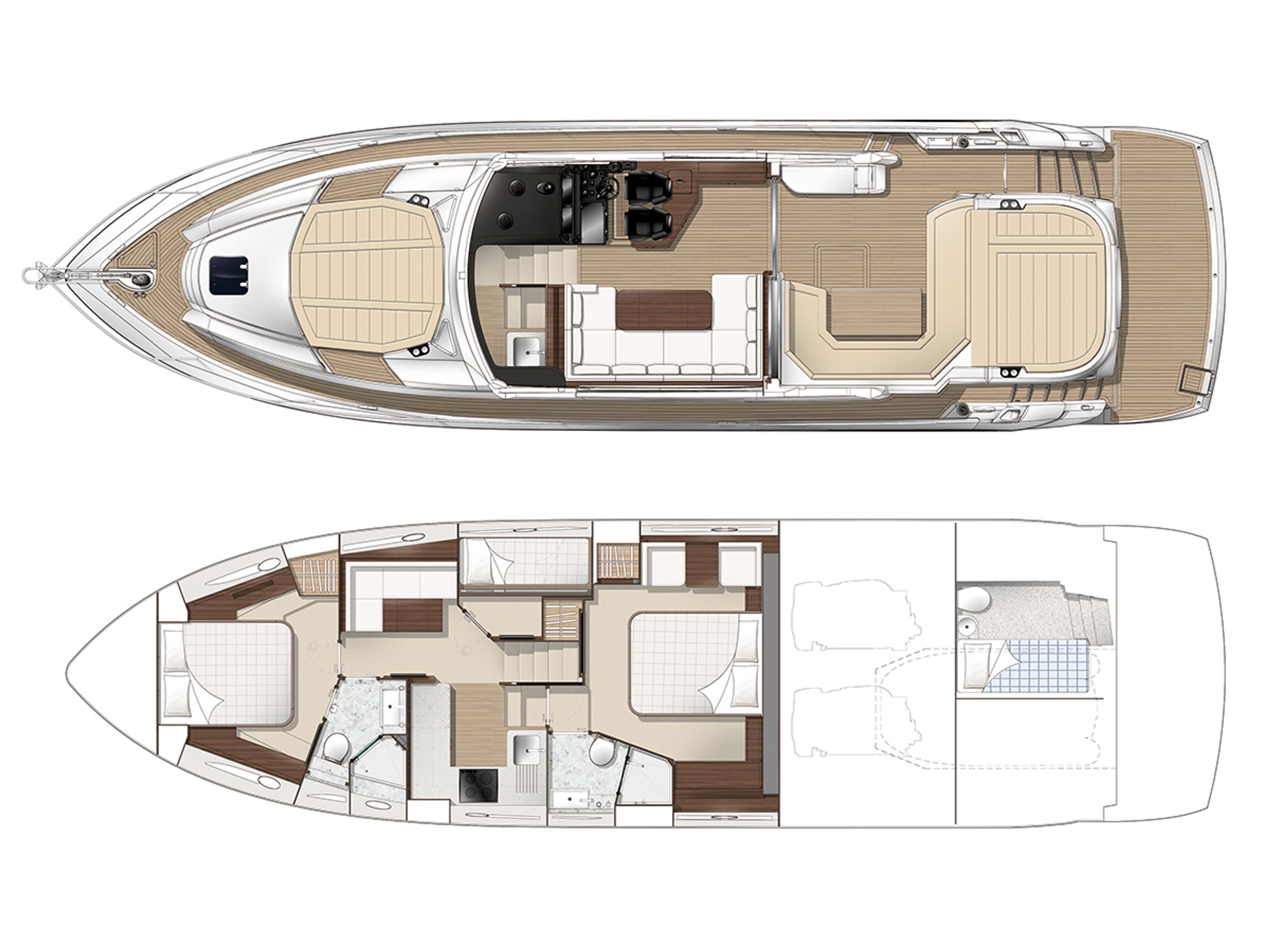 Whether you want to enjoy the sun rays or the shadow and the air-conditioning, there is a place for you. The cockpit wetbar and the interior bar ensure you to never run short of cold drinks.